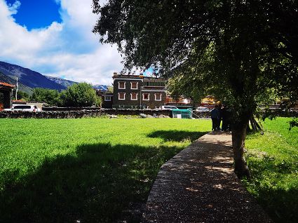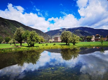 夏日,暖陽溫柔,沿途入眼皆是綠意。聽說,俄色花盛放的時(shí)候,潔白的花成簇成團(tuán),一樹樹漫山遍野,像九天的云朵堆滿山谷田野,汽車從公路疾馳,風(fēng)里都是俄色的清香。我們來的時(shí)候稍微遲了,錯過了俄色的花期,花開荼蘼,殘花在蒼翠的枝葉里躲藏,風(fēng)里是飛舞的花瓣,紛紛揚(yáng)揚(yáng),在棕紅的棧道鋪成白色的云錦,樹下是芬芳的余味。棧道邊,金黃的雪白的野花鋪灑在翠綠的草甸上,像濃烈的水彩。地里的青稞,綠得晃人眼睛,綿延的是木雅人勤勞與希望。遠(yuǎn)處,木雅民居在各種深綠淺綠的陪襯下更加的濃墨重彩。