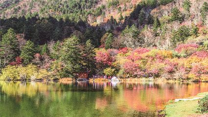 水面碧波蕩漾,不帶有一絲瑕疵,樹木金黃色,鮮艷的杜鵑花在縱情歌唱,一切都那么原汁原味。