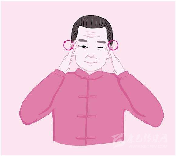 2.按揉太陽(yáng)穴:順時(shí)針旋轉(zhuǎn)一周為一拍,約做32拍。