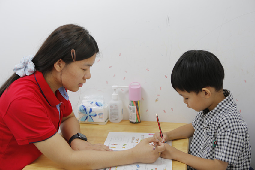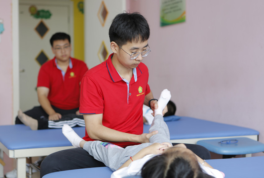 理療師幫助小朋友做康復(fù)治療。