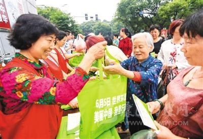 6月4日,江西省新余市渝水區(qū)城北街道辦的志愿者在恭惠農(nóng)貿(mào)市場門口向群眾免費發(fā)放環(huán)保袋。周亮 攝