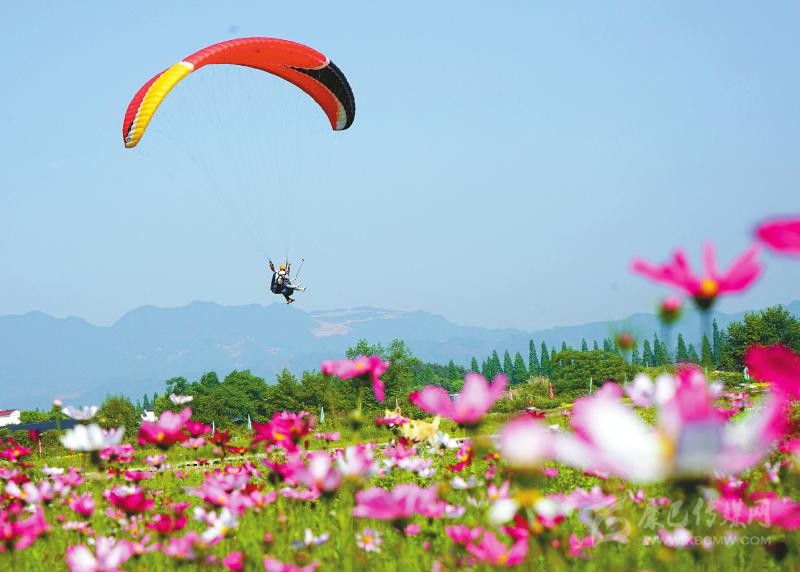 5月4日,游客在浙江省金華市武義縣大斗山飛行營地體驗滑翔傘?!拔逡弧毙¢L假期間,許多人選擇到戶外與大自然親近。新華社發(fā)