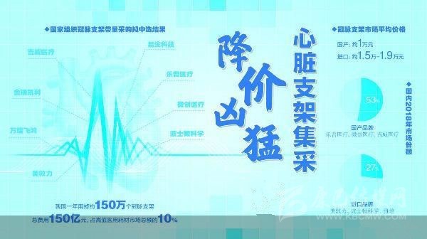 截至目前,地方層面已發(fā)起冠脈支架的集采嘗試。例如,2019年7月24日,江蘇省醫(yī)療保障局網(wǎng)站發(fā)布通知顯示,江蘇省陽光采購聯(lián)盟將組織55家成員單位,以上一年度總采購量的70%估算組團聯(lián)盟采購總量,對雷帕霉素及其衍生物支架和雙腔起搏器進行帶量采購。從中選結(jié)果來看,隨后支架價格被壓縮在2850-8666元之間,其中涵蓋了進口及國產(chǎn)品種,中選支架價格平均降幅達51%。