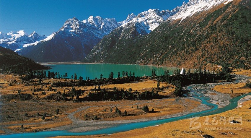 玉隆拉措又名新路海,海拔4040米,傍川藏公路。新路海為冰川湖泊,平均水深10米,面積6.2平方公里。湖泊三面依山,一面臨塬,凝靜時“秋水共長天一色”,象一碩大的明鏡映奇瑰山色于水中,又如靚藍(lán)的畫布上碧峰入幀;時有輕風(fēng)蕩來,湖中波光瀲滟,若仙女弄影。夏季湖水清澈見底,冬春時則靜謐得滲出翠綠來。正面處是一座雪影婆娑的奇峰,巋然不動;與雀兒山相呼應(yīng),兩峰之間冰清玉潔,整個溝壑處冰瀑縱橫錯落,呈跳躍狀直撲谷底而來。