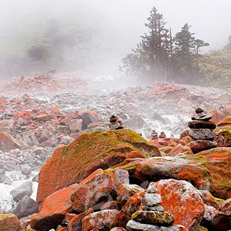 海螺溝的姊妹溝,位于海螺溝西北10 余公里的地方,周?chē)?5 座5000 米以上的高峰,從海拔2100 米逐次向上延伸至7556 米的貢嘎山主峰,目前還是一個(gè)鮮有人跡的地方。溝內(nèi)的景色原始自然,特有的紅石溝和奇溝內(nèi)的石頭千奇百怪,大面積的彩葉林帶更是秋天的寵兒。