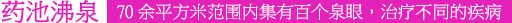 稱(chēng)為藥泉的沸泉群水溫高達(dá)90℃,含有多種對(duì)人體有益的元素,不同的泉眼(如明目泉、健胃泉、洗腳泉等),分別對(duì)治療眼疾、胃病、風(fēng)濕等病癥具有不同的療效。