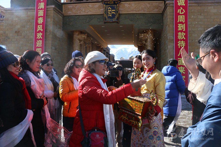 在切瑪盒前體驗(yàn)灑青稞和糌粑祈福儀式。