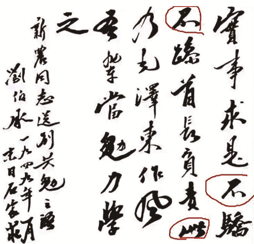 以上是劉帥1949年的書(shū)法,距離1936年13年的時(shí)間,“不” “此”二字,明顯與布告上的風(fēng)格一致。國(guó)、合、軍等單個(gè)的字,在建國(guó)后的書(shū)法作品與布告比較,都可以在劉帥其他書(shū)法中看到明顯出自一人。
