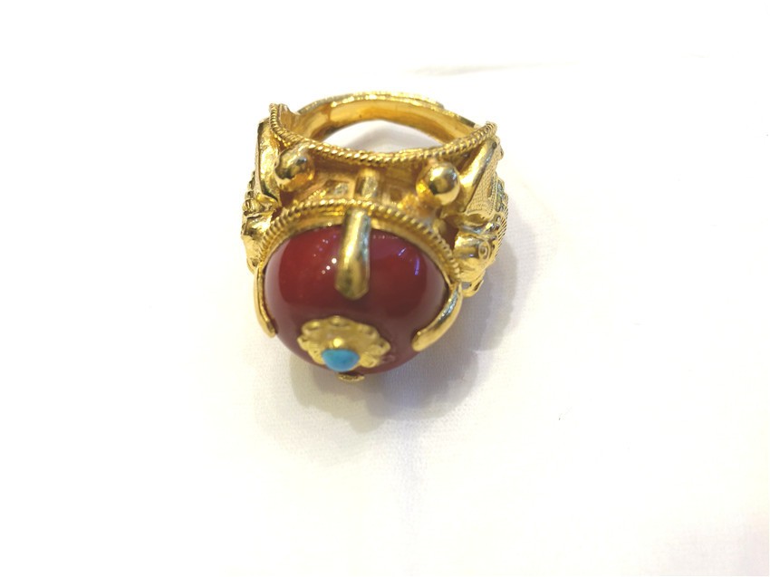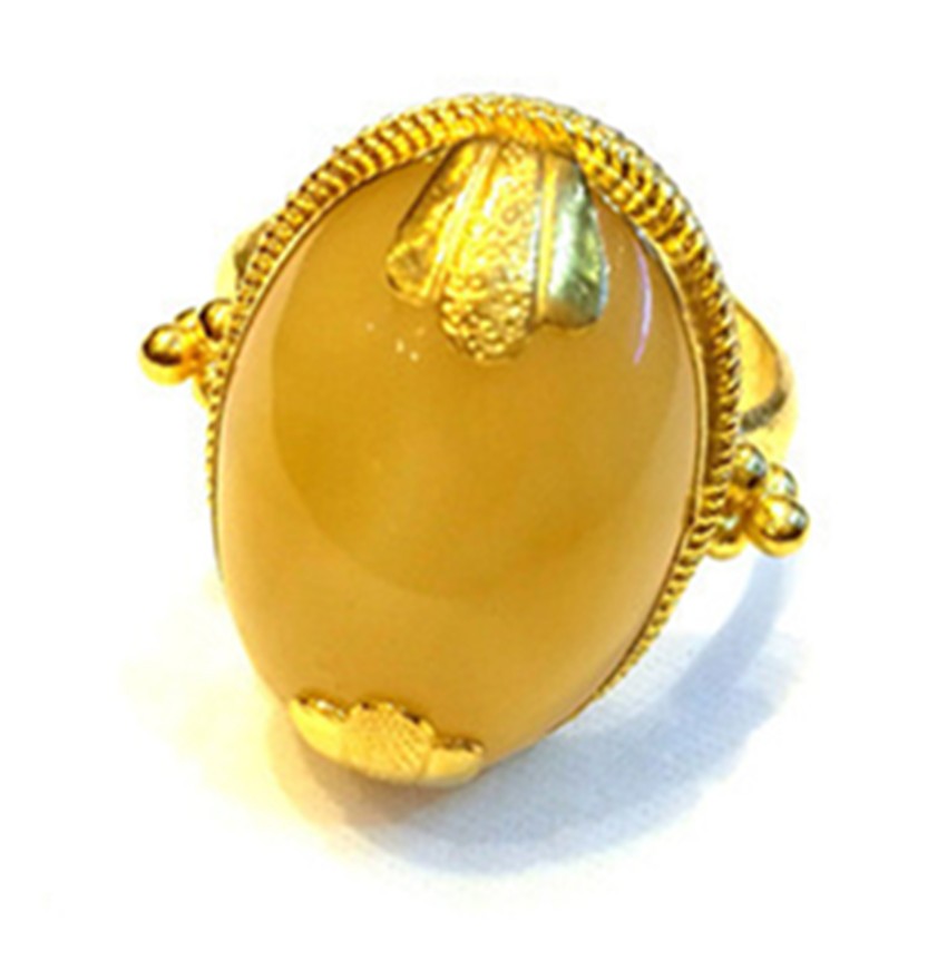 蜜蠟是藏家裝飾中的上成品,藏民族對蜜蠟的喜愛是非常誠懇的,表達(dá)著他們對大自然的無限崇敬之情與大自然饋贈(zèng)的感謝之情。在他們看來,蜜蠟除了能夠作裝飾品佩戴、收藏之外,最引人注目的就是靈性修行之功效,設(shè)計(jì)師在此款戒指的設(shè)計(jì)上,緊扣藏民對蜜蠟的喜愛,并將漢式花邊與蜜蠟結(jié)合,是對藏漢文化交流較好的體現(xiàn)。