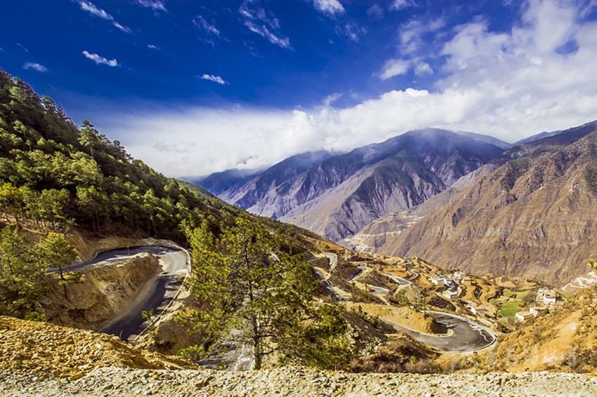 如今,所有鄉(xiāng)村通了硬化路,橫跨在金沙江上的十余座跨江大橋氣貫如虹,天塹變通途。過去我們下鄉(xiāng)時,從日雨到曲雅貢,只有一條從因都壩背后的半山腰路。蒼茫大山,路上幾乎看不見一顆大樹,也找不到一滴水源。從山腰看江畔的因都壩,只有兩戶人家,幾株綠樹總令焦渴難耐的我們望“綠”興嘆!下山走到金沙江邊,熾烈陽光從河灘上反射,火辣辣照在臉龐和皮膚,熱浪令人窒息,感覺目的地遙不可及?,F(xiàn)今,干部下村完全不需要走路,走路下鄉(xiāng)對年輕人來說簡直不可思議。公路像一條飄帶環(huán)繞山間,使散落在峽谷中的村寨愈發(fā)展現(xiàn)出欣欣向榮的新風貌。