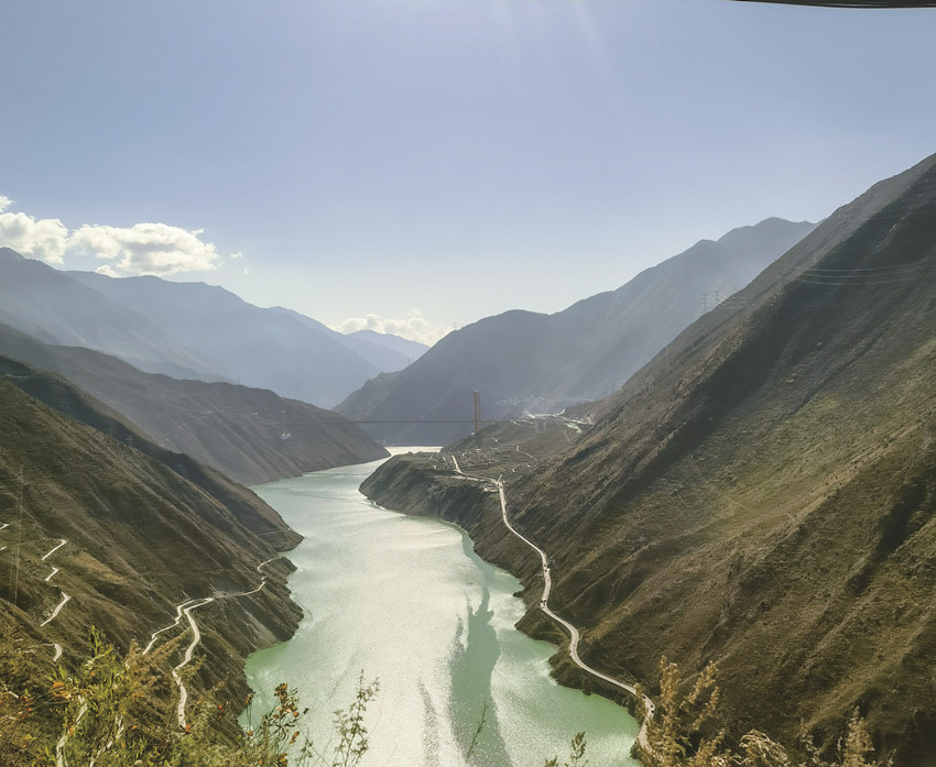 上嵐安的盤山路,在不停的彎折,每一個折又將路往上抬升一些,看著離大渡河越來越遠(yuǎn),應(yīng)該離嵐安近了。汽車在這條并不寬的路上行使,車窗外掠過的景色讓人有些意外。從來沒有從這個角度看過大渡河和沿河的景色,耀眼的陽光下,嵐安大橋橫跨大渡河,不遠(yuǎn)的地方是一個小村子,河水靜靜的流淌,平靜的河面如緞面般光滑。順著河流的方向,更遠(yuǎn)的地方就是雅康高速上的大渡河大橋,紅色的大橋在周圍藍(lán)的、綠的、灰的、白的顏色之中,很搶眼。這時,我們走過的路,也在身后像一條細(xì)細(xì)的白色帶子繞在山坡上。路旁高高的野草隨風(fēng)而動,黃色的莖須像極了豐收時的青稞。因?yàn)槭堑谝淮蝸恚恳谎劭匆姷亩际切迈r,上山的路,也就沒有想象中艱難。不過,聽說這條還算平坦的水泥路是新修的,之前的土路,又窄又陡,遇到會車都是很困難的。
