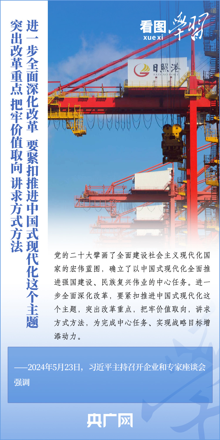 改革是發(fā)展的動(dòng)力。5月23日,習(xí)近平總書(shū)記在山東濟(jì)南主持召開(kāi)企業(yè)和專(zhuān)家座談會(huì)并發(fā)表重要講話。總書(shū)記強(qiáng)調(diào),進(jìn)一步全面深化改革,要緊扣推進(jìn)中國(guó)式現(xiàn)代化這個(gè)主題,突出改革重點(diǎn),把牢價(jià)值取向,講求方式方法,為完成中心任務(wù)、實(shí)現(xiàn)戰(zhàn)略目標(biāo)增添動(dòng)力。一起來(lái)學(xué)習(xí)!