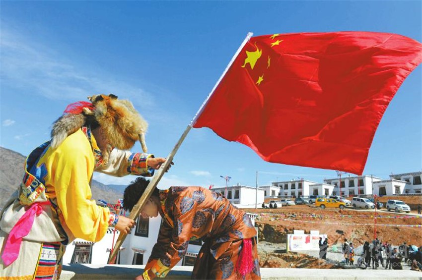 得榮縣白松鄉(xiāng)同歸村村民搬新家,在房頂上插上國旗。 (資料圖片)