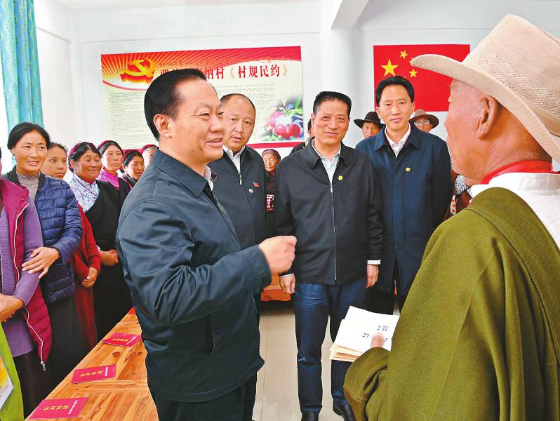 在村民澤翁家中,彭清華細(xì)致察看整修后的旅游民宿,了解房屋結(jié)構(gòu)功能、抗震設(shè)防標(biāo)準(zhǔn)和修建費(fèi)用等,與一家人拉家常、聊增收,鼓勵(lì)他們?cè)俳釉賲枺讶兆釉竭^越好。雅德鄉(xiāng)交納村平均海拔3300米,是典型的高原藏區(qū)貧困村。彭清華沿著崎嶇的山路步行來到貧困戶亞瑪忠登和根呷家中,與他們圍坐在一起,共同分析致貧原因和脫貧進(jìn)展,詳細(xì)了解各項(xiàng)幫扶措施落實(shí)情況,為他們脫貧增收鼓勁支招。在交納村村委會(huì)辦公室,彭清華與在這里參加合作社入股分紅活動(dòng)的村民們親切交談。他對(duì)在場(chǎng)的村干部和鄉(xiāng)親們說,習(xí)近平總書記、黨中央十分牽掛藏區(qū)群眾,對(duì)扎實(shí)做好藏區(qū)經(jīng)濟(jì)發(fā)展、民生改善和社會(huì)和諧穩(wěn)定特別是脫貧攻堅(jiān)等方面工作作出一系列重要指示、提出明確要求。我們要認(rèn)真學(xué)習(xí)領(lǐng)會(huì)、堅(jiān)決貫徹落實(shí)。希望鄉(xiāng)親們始終銘記習(xí)近平總書記的深切關(guān)懷,進(jìn)一步堅(jiān)定脫貧信心,大力發(fā)展生產(chǎn),積極學(xué)習(xí)技術(shù),尤其要重視孩子們的培養(yǎng)教育,讓適齡少年兒童都能接受義務(wù)教育,堅(jiān)決阻斷貧困代際傳遞。要充分發(fā)揮群眾的積極性和主動(dòng)性,引導(dǎo)村民依靠自己的辛勤勞動(dòng)拔窮根、摘窮帽,早日脫貧致富奔小康。