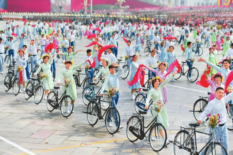 在10月1日上午進(jìn)行的國慶70周年群眾游行中,上百名少男少女騎著自行車從廣場通過。這個(gè)主題為“青春萬歲”的場景喚醒了很多人對(duì)20世紀(jì)80年代的時(shí)代記憶……這是本次群眾游行中的第一個(gè)情境式行進(jìn)。