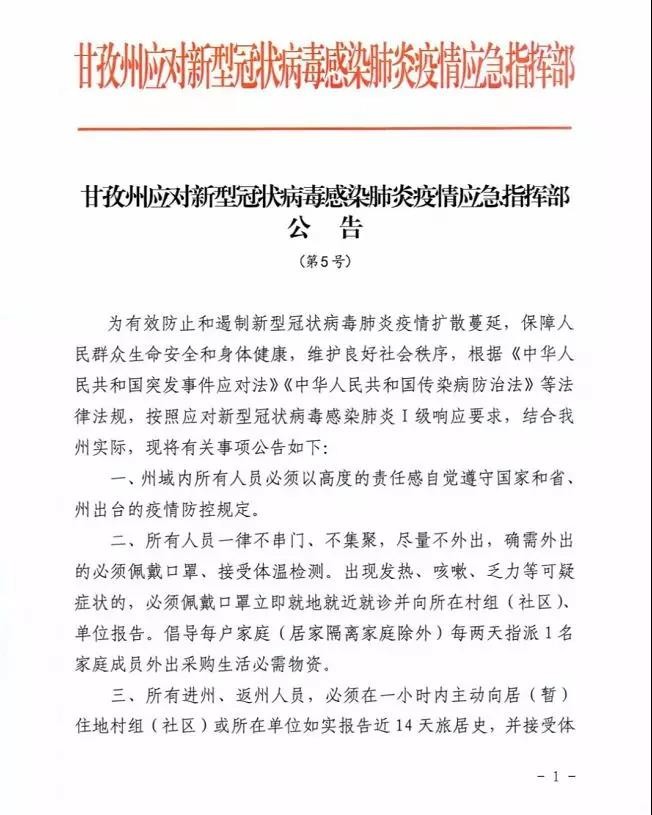 一、州域內(nèi)所有人員必須以高度的責(zé)任感自覺遵守國家和省、州出臺的疫情防控規(guī)定。二、所有人員一律不串門、不集聚,盡量不外出,確需外出的必須佩戴口罩、接受體溫檢測。出現(xiàn)發(fā)熱、咳嗽、乏力等可疑癥狀的,必須佩戴口罩立即就地就近就診并向所在村組(社區(qū))、單位報告。倡導(dǎo)每戶家庭(居家隔離家庭除外)每兩天指派1名家庭成員外出采購生活必需物資。三、所有進(jìn)州、返州人員,必須在一小時內(nèi)主動向居(暫)住地村組(社區(qū))或所在單位如實(shí)報告近14天旅居史,并接受體溫檢測。對不主動如實(shí)申報和拒絕接受體溫檢測、醫(yī)學(xué)觀察等防控措施的,一律依法從嚴(yán)追責(zé)。四、所有確診病例、疑似病例、醫(yī)學(xué)觀察(含居家隔離)對象一律不得離開醫(yī)院和隔離場所,實(shí)行“硬管控”,生活必需物資可委托他人代購。脫離管控的,一律依法從嚴(yán)追責(zé)。五、所有村組、社區(qū)必須落實(shí)屬地管理要求,實(shí)行網(wǎng)格化管理,責(zé)任到人、聯(lián)系到戶,組織轄區(qū)所有單位和人員參與群防群控,停止聚集聚餐活動,加強(qiáng)城鄉(xiāng)環(huán)境衛(wèi)生綜合整治,定期全面開展預(yù)防性消毒,將廢棄口罩等特殊有害垃圾投放到指定地點(diǎn)。六、所有村組實(shí)行封閉式管理,每天進(jìn)行全員篩查、體溫檢測、登記備案、建立臺賬并及時上報。必須嚴(yán)控人員和車輛進(jìn)出,確需進(jìn)出的人員必須主動出示有效證件,并通過體溫檢測、村組負(fù)責(zé)人批準(zhǔn)備案。七、所有居民小區(qū)、單位實(shí)行封閉式管理,落實(shí)社區(qū)管小區(qū)、小區(qū)(物業(yè))管居民要求,每天進(jìn)行全員篩查、體溫檢測、登記備案、建立臺賬并及時上報。無物業(yè)管理的小區(qū)(樓棟)一律由社區(qū)管理。必須嚴(yán)控人員和車輛進(jìn)出,確需進(jìn)出的人員必須主動出示有效證件,并接受管理人員體溫檢測、登記備案。八、所有宗教活動場所一律實(shí)行封閉式管理、暫停對外開放,禁止舉辦集體宗教活動,禁止任何形式的聚集念經(jīng)。寺管會必須落實(shí)群防群控要求,每天進(jìn)行全員篩查、體溫檢測、登記備案、建立臺賬并及時上報。所有僧尼不得串門、不得外出,不得到群眾家中念經(jīng)。九、所有機(jī)關(guān)企事業(yè)單位必須對返崗人員進(jìn)行健康管理,建立管理臺賬,并向所在社區(qū)(村組)報備,對確認(rèn)無可疑癥狀的準(zhǔn)予返崗工作。單位食堂必須規(guī)范管理,實(shí)行分散就餐。十、非居民生活必需的公共場所一律關(guān)閉,經(jīng)批準(zhǔn)營業(yè)的公共場所中央空調(diào)一律關(guān)停。商場、超市、賓館、飯店、農(nóng)貿(mào)市場、公共客運(yùn)、個體商戶等市場經(jīng)營主體必須嚴(yán)格落實(shí)疫情防控措施,每天開展預(yù)防性消毒工作,從業(yè)和進(jìn)入人員一律佩戴口罩、檢測體溫、備案登記。藥店、診所、村衛(wèi)生室出售退燒、咳嗽類藥品必須實(shí)名制登記,并每日上報轄區(qū)疾控部門,對近14天有重點(diǎn)疫區(qū)旅居史的立即上報??爝f、外賣實(shí)行無接觸配送。十一、車站、機(jī)場和交通檢疫站點(diǎn)實(shí)行進(jìn)出人員全覆蓋體溫檢測和登記備案制度,對體溫異常人員立即采取就地就近隔離觀察。對拒絕配合的,公安機(jī)關(guān)依法協(xié)助強(qiáng)制執(zhí)行;對妨害執(zhí)行公務(wù)的,公安機(jī)關(guān)依法從嚴(yán)從重處理。十二、廣大黨員、干部、各級人大代表、政協(xié)委員要發(fā)揮帶頭作用,嚴(yán)格管好家人和親屬,積極主動參與疫情防控工作,帶動街坊鄰居自覺遵守相關(guān)規(guī)定。 本公告自發(fā)布之日起實(shí)施,終止日期另行公告。 甘孜州應(yīng)對新型冠狀病毒感染肺炎疫情應(yīng)急指揮部