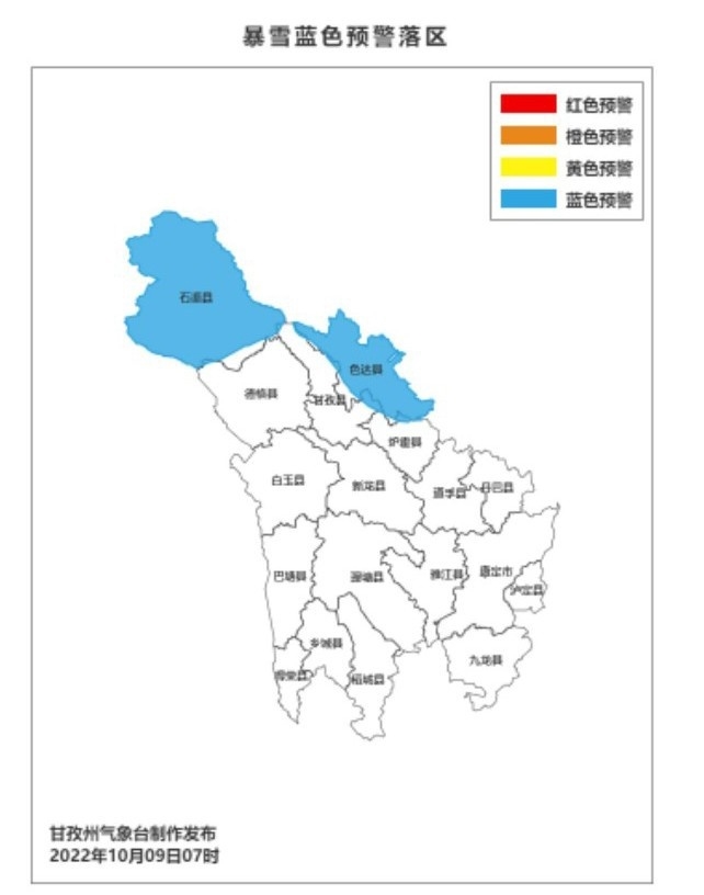 10月9日上午,甘孜州氣象臺發(fā)布了今年第一個暴雪藍色預(yù)警: