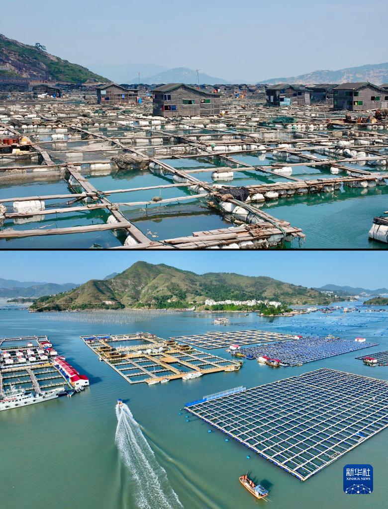 拼版照片:上圖為2007年7月拍攝的福建寧德三都澳海域傳統(tǒng)漁排(資料照片);下圖為2023年11月18日拍攝的福建寧德七星海域升級(jí)改造后的漁業(yè)養(yǎng)殖區(qū)(無人機(jī)照片,新華社記者姜克紅攝)。新華社發(fā)