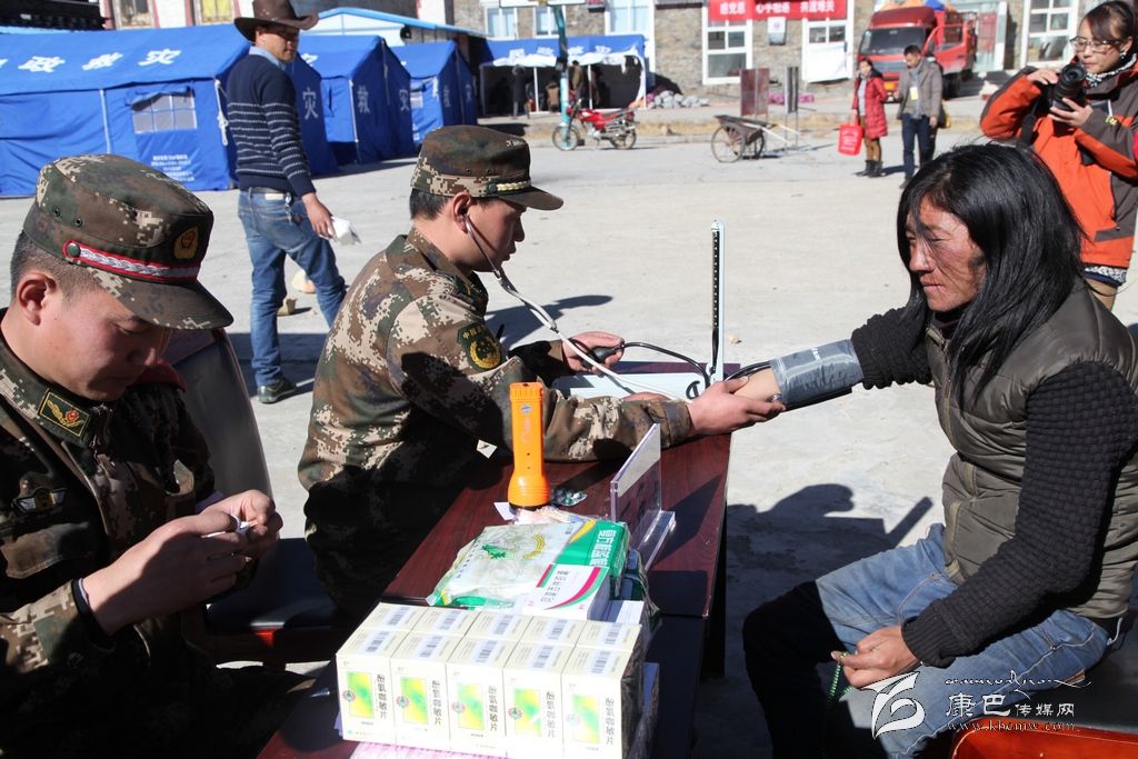 “醫(yī)生,麻煩你給我一點拉肚子的藥,我肚子有點痛!”在江巴村活動室外的壩子里,記者看到一位牧民來到武警四川總隊二支隊的義診就醫(yī)點取藥,幾位軍醫(yī)正在為農(nóng)牧民看病、測血壓……軍醫(yī)陳海波告訴記者說:“震后病菌很容易滋生感冒、腹瀉等流行疾病,地震后的第二天我們就來到這里,每天都為這里的農(nóng)牧民義務(wù)看病就診,最多的時候每天有近50人來看病,今天我們就為47人進行了義診,里面有一兩個人出現(xiàn)了感冒和腹瀉的狀況。還有一些病人血壓有點高,我們都給他們開了藥,并對他們進行了叮囑,要求他們每天都進行復(fù)查。”